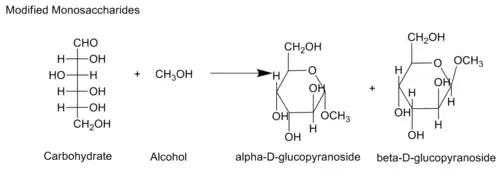 Ring Structure of Monosaccharides After hemiacetals and hemiketals form, the carbohydrate will form a ring structure. For example, in Glucose the Hydroxyl group from the Carbon 6 will attack the carbonyl Carbon from Carbon 1, with a hemiacetal intermediate. The Carbon that will then change from a carbonyl carbon to a carbon with a hydroxy will then be called an anomeric carbon. An anomeric carbon is the hemiacetal or hemiketal that is bounded by an alcohol group and an ester bond. Anomers are another form of isomers that differ in the hemiacetals or hemiketals.The most common structure of a glucose ring is the alpha conformation in contrast with the sterically hindered Beta conformation. The alpha conformation is structure in which the hydroxyl in Carbon 1 is facing the opposite of the plane as carbon 6, while the beta conformation is facing in the same plane as the Carbon 6 thus causing steric hinderance. For this reason of steric hinderance the alpha conformation is much more stable than beta.