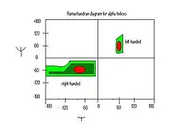 - Alpha helix falls within quadrant 1 (left-handed helix) and 3 (right-handed helix) in the Ramachandran diagram