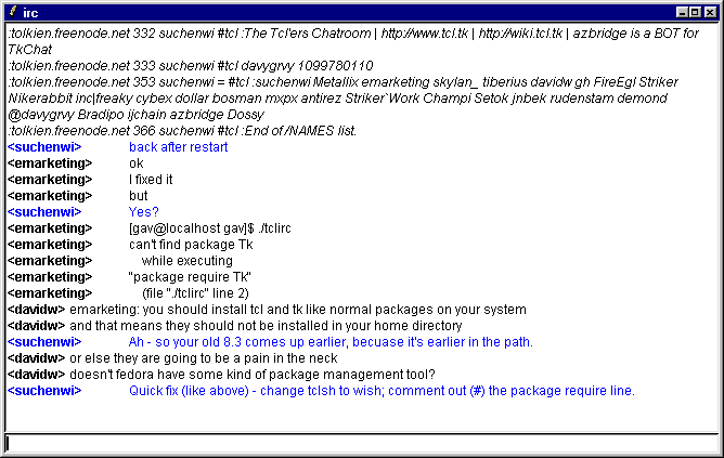 As before in the Tcl section, here's a working little script again: a client for IRC (Internet Relay Chat) in 38 lines of code, that features a text and an entry widget: