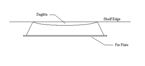 How much curve? Let's say you are looking at a pie dish. The outside bottom, which is what we will work with, should have a pretty smoothly concave curve. Hold it upside down with the concave bottom up against the front edge of a straight shelf. The gap formed by the glass and the shelf is our sagitta! Or the beginning of it. There should not be any big bumps or dips in the curved surface of the glass when compared to the straight edge of the shelf. However, don't worry about any embossed words or logos. They grind right off.