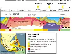 Below is a regional cross section of Indonesia from west to east showing the relationship of the tectonic components of Indonesia, their depth, and structural features.
