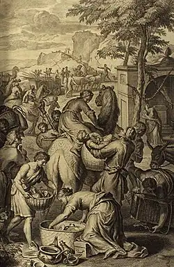 Jacob came to an eastern land where he saw a well with a great stone rolled upon it and three flocks of sheep lying by it. Jacob asked the men where they were from, and they said Haran. Jacob asked them if they knew Laban, and they said that they did. Jacob asked if Laban was well, and they said that it was, and that his daughter Rachel was coming with his sheep. Jacob told the men to water and feed the sheep, but they replied that they could not do so until all the flocks had arrived. When Jacob saw Rachel arrive with her father's sheep, he rolled the stone from the well's mouth, and watered Laban’s sheep. Jacob kissed Rachel, wept, and told her that he was her kinsman, and she ran and told her father.