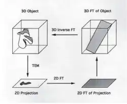 A projection occurs when a 3D image is taken and those points are then put onto a 2D plane. Each point in the 2D plane corresponds to a slice in the 3D volume and is based on Radon's theorem. It is possible to obtain a 3D volume, get the 2D projection, subsequently take the Fourier transform of the projection and use the Fourier transform of the projection to obtain a "slice" of the 3D volume. Thereafter, it is possible to take the inverse Fourier transform of the "slice" yielding a 3D volume.