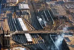 - The trackage may involve a mainline [2nd image, that yard is on the opposite side of the two tracked mainline; only the mainline has expensive switch motors controlling their junction points], often with an prohibition the switch engine driver must avoid using it, or has to use the main line only in a limited manner (time window), or the action can be off on a sleepy rail spur with little or no other traffic to dodge.
