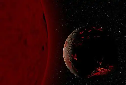 Celestia now makes it possible for a student to view the entire known universe, planets, stars, moons, sun, satellites, and constellations on his or her computer screen - everything a planetarium can do and a huge amount more. Celestia also enables students to view the solar system at any point in history or the future. For example, the picture to the right shows a screenshot of Celestia showing the position of the sun and condition of the earth approximately 5 billion years from now. |