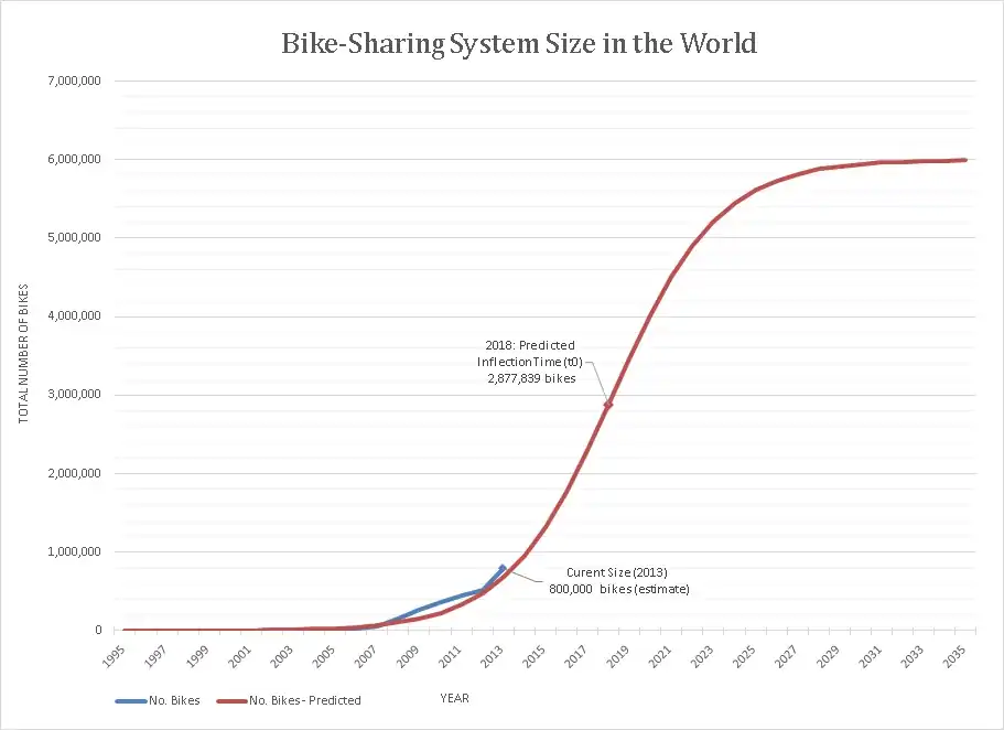 The Life-Cycle analysis uses a S-Curve prediction method to detect a system’s three main deployment periods: birth, growth and maturity. The model uses system size data (total number of bikes in bikesharing systems in the world) for the 1995-2013 period for its prediction.