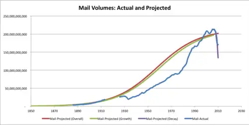- ↑ a b "Pieces of Mail Handled, Number of Post Offices, Income, and Expenses, 1789 to 2010". Historian, United States Postal Service. 2011. Retrieved 7 October 2011.