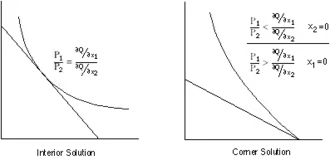 The isoquant model can be used to illustrate the solution of finding the least cost way of producing a given output or, equivalently, the most output from a given budget. The innermost budget line corresponds to the input prices which intersect with the budget line and the optimal quantities are the coordinates of the point of intersection of optimal cost with the budget line. The solution can be an interior or corner solution as illustrated in the diagrams below.