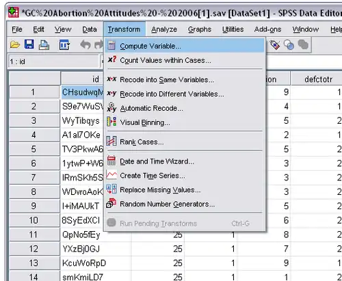 To simultaneously create and compute this variable, which we'll call abscale, click “Transform” → “Compute Variable”: