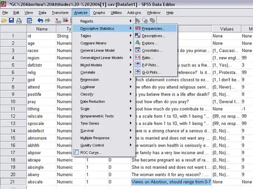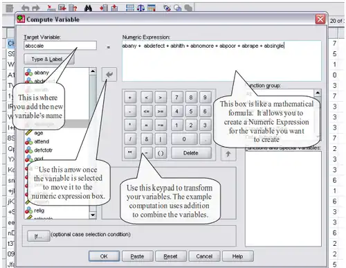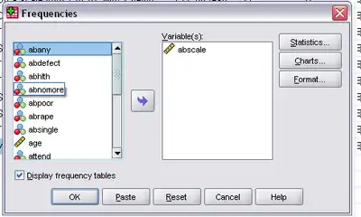 In our example, seven variables are added to create the new scale: abscale. To do this we have only to add the abortion variables, as shown above. Once you're done, click “OK.” Your new variable will then appear in the Data Editor under the “Variable View,” on the ultimate row.