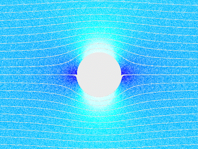 Just in front of the cylinder, the fluid is almost still. So it was slowed down. The pressure on the front of the cylinder is therefore higher than the pressure upstream, as expected. Just behind the cylinder, the fluid is also almost still. It is therefore accelerated to join the flow downstream. The pressure on the rear of the cylinder is therefore higher than the pressure downstream, as one would not expect. If the fluid is without viscosity, the pressures on the rear and on the front of the cylinder compensate each other exactly and the cylinder is therefore not dragged by the flow, as if one could put one's legs in a torrent without being dragged towards downstream, or if a projectile could pass through the air without being slowed down. To explain the drag force, viscosity (the force of fluid friction) and turbulence must be taken into account.