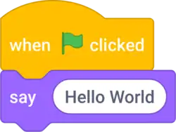 - Change the text in the purple block from "Hello!" to "Hello World".