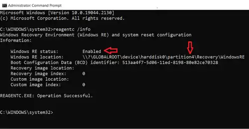 - Confirm the status of the RE with reagentc /info, noting that it is enabled, and that the RE has the installed path as intended.