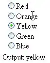 You should see all the possible values when you use a full appearance. Each time you click on one of the radio buttons, the value of MyCode in the model will be updated and the output should automatically be updated. Note that the value is displayed (in lowercase), not the label.