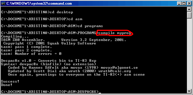To compile your program myprog.z80 first open a Command Prompt (Start > Run... > command in Win9x, or Start > Run... > cmd in WinNT). You should be faced with a black window with some white text saying what folder you are in. The first step is to change the folder to your programs folder. To do this use the following commands: