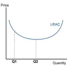 Кривая долгосрочных средних издержек показывает минимальные издержки на единицу продукции, производимой при каждом возможном объёме производства, когда все ресурсы относятся к переменным затратам, фирма имеет время, чтобы изменить комбинацию ресурсов и оптимизировать свой размер[7].