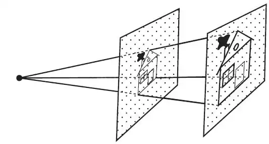 Рисунок 5. Гомотетия как проекция фигуры с одной плоскости на другую, параллельную ей плоскость с помощью центрального пучка лучей.