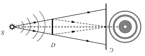 Рис. 1. Точечный источник посылает световую волну на круглый непрозрачный диск D, а на экране Э в центре наблюдается светлое пятно Араго-Пуассона