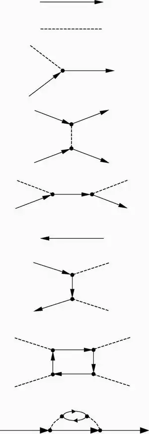 В этих диаграммах электрон представляется линией со стрелкой, смотрящей в положительном направлении, вправо: