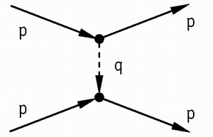 Прежде чем говорить подробнее об этих взаимодействиях, остановимся на одном важном утверждении квантовой теории — о радиусе действия тех или иных сил. Рассмотрим две частицы (p+p), взаимодействие между которыми осуществляется путём обмена какими-то промежуточными частицами (q), как это показано на диаграмме Фейнмана: