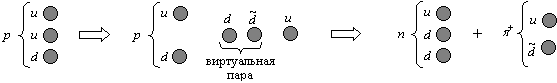протекающую при сообщении протону достаточно большой энергии — см. рис. 6. Пусть энергия, сообщаемая протону, передаётся входящему в него u — кварку. Если энергия достаточно велика, то струна, соединяющая рассматриваемый кварк с «остатком» протона, может разорваться. При этом возможно рождение виртуальной пары . Далее, как видно из рис. 6, антикварк объединяется с исходным кварком u (отделяемым от протона) и образует пион . Второй же кварк из пары (d) возвращается в исходный адрон, в результате чего возникает нейтрон.