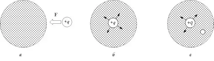 а — Пробный заряд q > 0 притягивается к равномерно заряженному шару; б — силы, действующие на пробный заряд (вблизи центра), уравновешивают друг друга; в — если в шаре имеется незаряженная полость («дырка»), то силы, действующие на пробный заряд, уже не уравновешивают друг друга