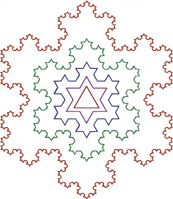 Снежинка рисуется рекурсивным образом. Сначала она выглядит как треугольник. Затем на сторонах этого треугольника рисуются треугольные выступы. Получается шеcтиконечная звезда. На сторонах этой звезды снова рисуются треугольные выступы (см. синюю фигуру). Процесс наращивания треугольных выступов можно продолжить до бесконечности и получить в пределе вполне корректно определённое множество точек на плоскости.