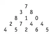 Формулировка задачи: На рисунке показан пример треугольника из чисел. Написать программу, вычисляющую наибольшую сумму чисел, через которые проходит путь, начинающийся на вершине и заканчивающийся где-то на основании.