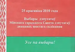 | 25 красавiка 2010 года Выбары дэпутатаў Мiнскага гарадскога Савета дэпутатаў дваццаць шостага склiкання Усе на выбары! (Перевод: 25 апреля 2010 года Выборы депутатов Минского городского Совета депутатов двадцать шестого созыва Все на выборы!) |