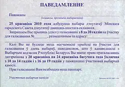 ПАВЕДАМЛЕННЕ Паважаны ___ (iнiцыялы, прозвiшча выбаршчыка). 25 красавiка 2010 года адбудуцца выбары дэпутатаў Мiнскага гарадскога Савета дэпутатаў дваццаць шостага склiкання. Запрашаем Вас прыняць удзел у галасаваннi з 8 да 20 гадзiн на ўчастку для галасавання № ___, размешчаным па адрасу: ___. Калi Вы не будзеце мець магчымасцi прыйсцi на ўчастак для галасавання ў дзень выбараў, паведамляем, што ў адпаведнасцi з Выбарчым кодэксам Рэспублiкi Беларусь Вы маеце права прагаласаваць датэрмiнова з 20 красавiка па 24 красавiка бягучага года ўключна з 10 да 14 гадзiн i з 16 да 19 гадзiн у памяшканнi ўчастковай выбарчай камiсii. Пры галасаваннi Вам неабходна мець пашпарт. Участковая выбарчая камiсiя. (Перевод: Уведомление. Уважаемый ___ (инициалы, фамилия избирателя). 25 апреля 2010 года пройдут выборы депутатов Минского городского Совета депутатов двадцать шестого созыва. Приглашаем Вас принять участие в голосовании с 8 до 20 часов на участке для голосования №___, расположенном по адресу: ___. Если Вы не будете иметь возможность прийти на участок для голосования в день выборов, уведомляем, что в соответствии с Избирательным кодексом Республики Беларусь Вы имеете право проголосовать досрочно с 20 апреля до 24 апреля текущего года включительно с 10 до 14 часов и с 16 до 19 часов в помещении участковой избирательной комиссии. При голосовании Вам необходимо иметь паспорт. Участковая избирательная комиссия.) | |||||
