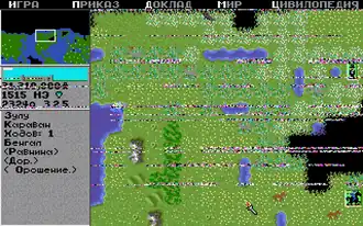 Итак, собственно после запуска программы предстоит выбрать тип монитора, управления и озвучки программы. Как правило, последовательность 1 4 1 даёт управление клавиатурой и мышью с обычным монитором, но если звуковая карта при этом не сработает (бывает всякое), то можно использовать для озвучки PC speaker, набрав 1 2 1. Далее идёт меню загрузки сохранённой игры, создания нового мира, игры (тип местности запоминается и будет использован и при следующем запуске), игры на случайной карте нового мира, или игры на карте Земли (более предсказуемо), уровня сложности. Если не препятствовать пробелом или вводом, программа покажет длинное интро с развитием планеты. Обратите внимание, что можно не только менять имя вождя, но и название народа, для чего при выборе в списке нужно нажать Esc и напечатать свой вариант; однако цвет и предлагаемые названия городов останутся без изменений (то есть желаемые имена придётся вводить самому). Всего можно играть с 6 соперниками (7 цивилизаций), выбирая один из 14 народов. Ещё одним соперником являются варвары; они не имеют столицы, с ними нельзя вести переговоры и создавать посольства. Варвары не интересуются наукой.