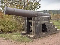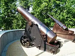 | Сестрорецкий инструментальный завод, город Сестрорецк, Санкт-Петербург | Каменский чугунолитейный завод | 1865 | 60-ти фунтовая бомбическая пушка системы Маиевского образца 1857 года | На левой цапфе пушки клеймо — «Каменской заводъ» №89, на правой цапфе год изготовления – 1865 и вес 387 пудов[30]. Пушки и якорь памятника «Пушки», установленного в 1991 году, были демонтированы на фортах Кронштадта. Пушечные лафеты изготовил цех завода, а одна из пушек является шведской. | ||