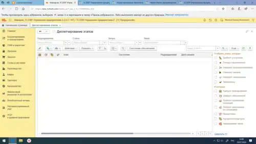 В «Управление очередью заказов» кнопкой «Диспетчирование этапов» открывается документ «Диспетчирование этапов» производства с установленным отбором по выбранному заказу.