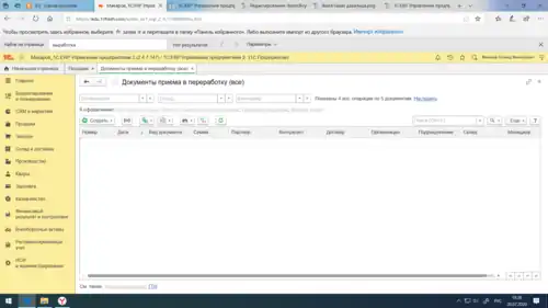 Рабочее место «Продажи»/«Приём в переработку»/«Документы приёма в переработку (все)» учитывает производственные операции переработчика, отображает следующие документы: «Возврат сырья давальцу», «Отчет давальцу», «Передача давальцу», «Поступление сырья от давальца», «Счет-фактура выданный», «Возврат сырья от переработчика», «Отчет переработчика», «Передача сырья переработчику», «Поступление от переработчика», «Счет-фактура полученный». Гиперссылка «К оформлению (передача в переработку)» по типу оформляемого документа позволяет перейти к списку документов передачи в переработку к оформлению.