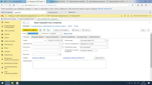 Документ «Производство»/«Межцеховое управление»/«Заказы на производство»/«Создать_Новый»/«Заказ на производство» учитывает потребности к выполнению производственных процессов разных типов и управления исполнением этой потребности.