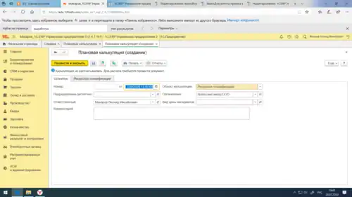 После заполнения закладки «Ресурсные спецификации» необходимо провести документ, чтобы была запущена калькуляция. Появится информационная строка