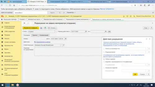 В документе «Производство»/«Нормативно-справочная информация»/«Разрешения на замену материалов»/«Разрешение на замену материалов» учитываются возможности замены материала на аналогичный. Разрешения применяются при составлении спецификации заказа на производство. В документе указывается период и область действия разрешения. На листе «Основное» указывается для каких «Действий» разрешается замена: «По предприятия в целом», для «Заказа на производство», «Подразделения», «Любых изделий», «Изделия, производимого по спецификации», «Указанному изделию». Если разрешение на замену материалов задается для Ресурсной спецификации, то набор заменяемых материалов определятся строками табличной части «Материалы» и услуги данной спецификации. По умолчанию к использованию будет предлагаться Разрешение на замену с более ранней датой ввода.