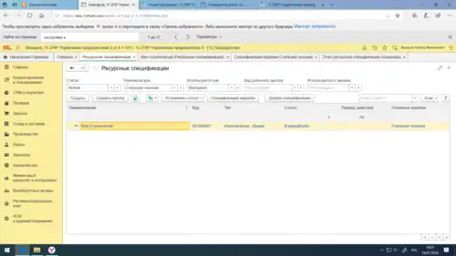 Рабочее место «Производство»/«Нормативно-справочная информация»/«Ресурсные спецификации»/«Ресурсная спецификация» описывает поэтапный производственный процесс и ресурсы, необходимые для его осуществления для производства продукции, выполнения работы, осуществления ремонта или разборки, а также переделы, на которых выпускаются полуфабрикаты, входящие в состав продукции.