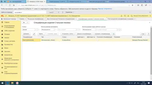 - «Статус» спецификации: «В разработке» (вносятся любые изменения, не используются в производстве, при возврате спецификации в этот статус идёт предупреждение и предлагается проверить, не используется ли спецификация где-либо), или «Действует» (действующая спецификация, не правится, для исправления возвращается в статус «В разработке»), или «Закрыта» (не доступна для использования, не редактируется).
