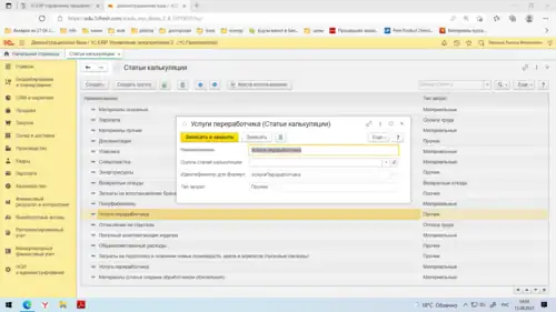 Справочник «Производство»/«Нормативно-справочная информация»/«Статьи калькуляции» используется для группировки производственных затрат в соответствии с используемыми на предприятии статьями калькуляции, является аналитикой, по которой можно будет увидеть себестоимость выпущенной продукции. В документе «_(Статьи калькуляции)» заполняется реквизит «Тип затрат», который состоит из списка, который используется в отборах документов и справочников (например, в «Ресурсной спецификации» на вкладке «Материалы и услуги» выбираются только «Статьи калькуляции» с типом «материальные»).