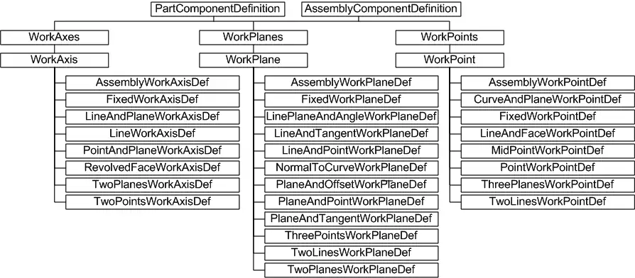 Для каждого вида рабочих элементов в API предусмотрены соответствующие коллекции WorkPoints, WorkAxes и WorkPlanes.