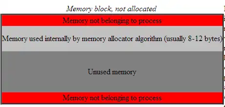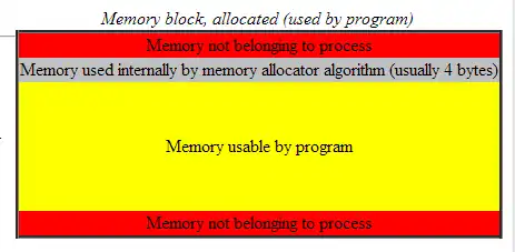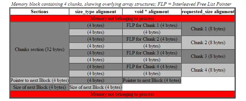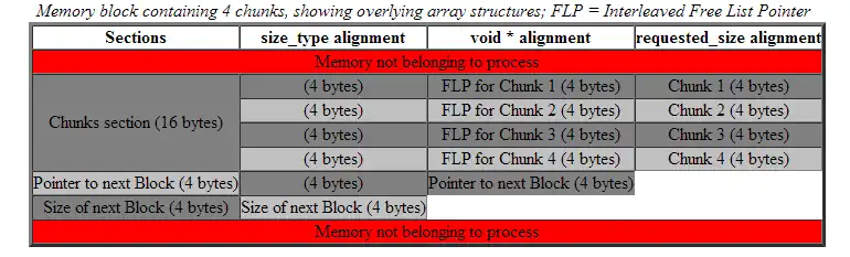 Каждая из этих частей может содержать заполнение для гарантирования правильного выравнивания каждой из этих частей. Размер первой части равен number_of_chunks * lcm(requested_size, sizeof(void *), sizeof(size_type)); размер второй части равен lcm(sizeof(void *), sizeof(size_type); и размер третьей части равен sizeof(size_type).