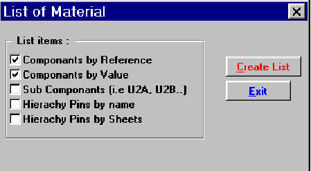 Это меню позволяет генерировать файл листинга компонентов и/или иерархических соединений (глобальных меток).