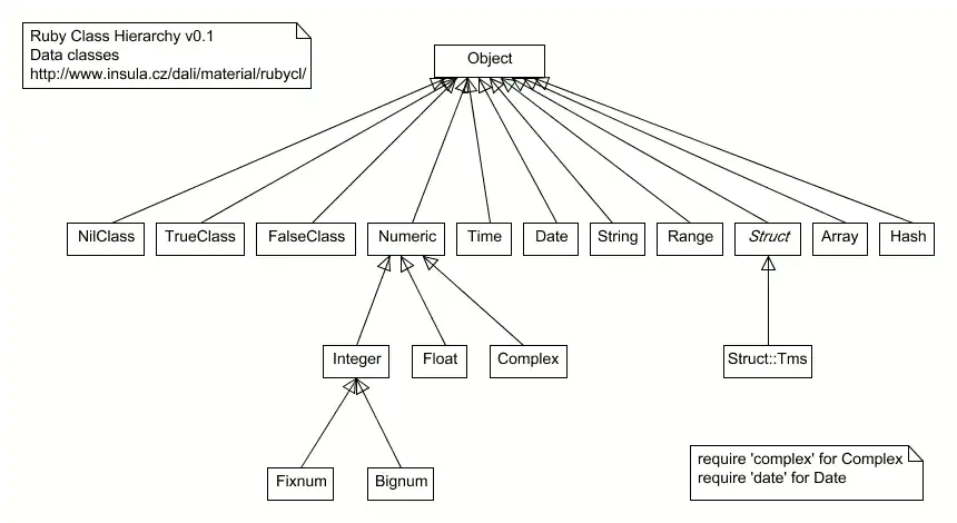 Данные любого типа в Ruby суть объекты тех или иных классов. Самые используемые встроенные типы данных: Fixnum (целые числа, меньшие ), Bignum (целые числа, большие ), Float (числа с плавающей точкой), Array (массивы), String (строки), Hash (ассоциативные массивы). Естественно, что это только базовые типы, но их вполне хватает для широкого спектра задач.
