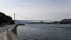 Ōshima is located in the north of Ehime prefecture, and has an area of 41.89 square kilometres (16.17 sq mi). Administratively, it was formerly divided between the towns of Yoshiumi and Miyakubo of Ochi District, Ehime; however, in January 16, 2005 both towns were absorbed into the city of Imabari. The highest elevation on the island is Mount Kirō, at 381.9 metres (1,253 ft). Compared to other islands in the Geiyo Archipelago, the island with many flat areas, which has permitted the developed of rice paddy fields. Other economic activities have traditionally included the cultivation of citrus fruits, mainly mikan, a small shipyard and stone quarries. The island is on the Shimanami Kaidō, an expressway between Honshū and Shikoku, and is linked to Hatakajima by the Hakata-Ōshima Bridge and Kurushima by the Kurushima-Kaikyō Bridge. The expressway has placed the island within commuting distance of Imabari.