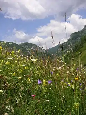 The Șureanu Mountains are divided into the Sebeș Mountains to the east and the Orăștiei Mountains to the west. In all, they cover an area of 1,585 square kilometres (612 sq mi). The highest peak is Peter's Peak (Vârfu lui Pătru), at 2,130 metres (6,990 ft);[1] other peaks are Șureanu Peak, at 2,059 m (6,755 ft) and Vârfu Negru, at 1,862 m (6,109 ft), as well as Aușelu, Comărnicelul, Gropșoara, and Pârva peaks. They are primarily a highland with meadows and pastures, with very large forested area throughout the surrounding 1,200 to 1,400 metres (3,900 to 4,600 ft) high mountains. In the southern area of these mountains there is a limestone region with several caves, hills, and gorges.