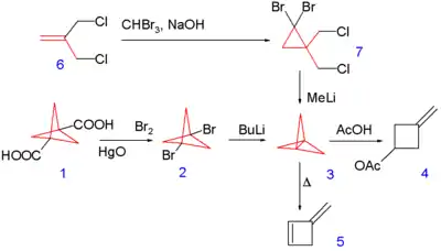 However, a much simplified synthesis was published by Szeimies.[5] It starts with dibromocarbene addition to the alkene bond of 3-chloro-2-(chloromethyl)propene 6 followed by deprotonation by methyllithium and nucleophilic displacements in 7[6] not isolated but kept in solution at −196 °C.