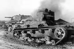 A T-26 lies smoking with a KV-1 behind in Russia in 1941