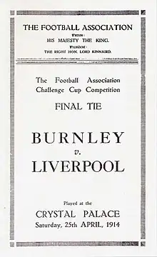 The 1914 FA Cup final was an association football match between Burnley and Liverpool on 25 April 1914 at Crystal Palace, London. It was the final match of the 1913–14 FA Cup, the 43rd season of the country's primary cup competition, the FA Cup. Both teams were appearing in their first FA Cup final. Burnley and Liverpool entered the competition in the first round and progressed through five rounds to reach the final, both playing seven matches including two replays. Burnley had eliminated four clubs from the Football League First Division—the first tier of English football—en route to the final.
