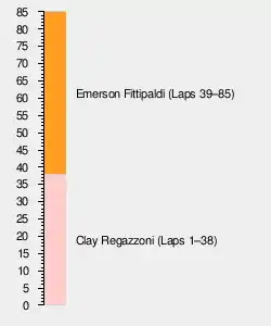 The rest of the opening lap was uneventful, with the field quickly settling down. Regazzoni had established a small lead over Fittipaldi, who was left to fend off Scheckter and Lauda, with Ronnie Peterson and James Hunt close behind. Carlos Pace came next with Patrick Depailler, Jean-Pierre Beltoise and Mike Hailwood, while Hans-Joachim Stuck rounded out the field after a terrible start.